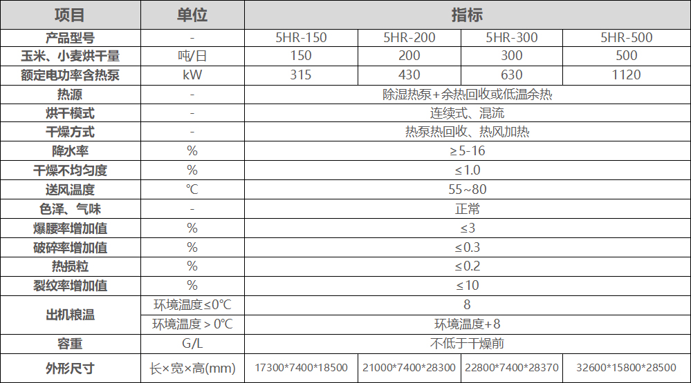 5HR熱泵糧食烘干機型號列表